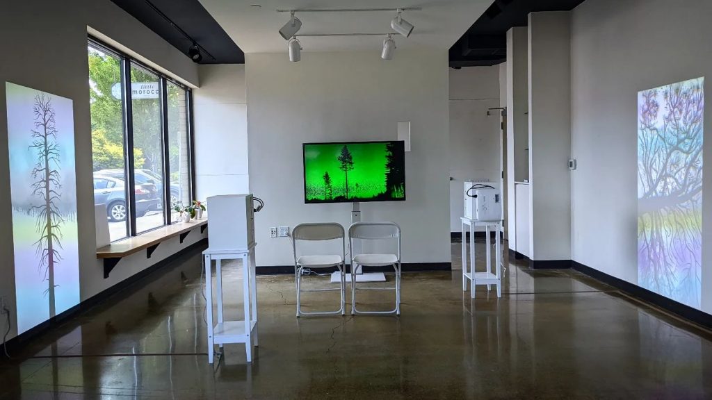 In the narrative video “Dendrostalkers,” which begins with an emergency warning from the National Forest Service, two sisters attempt to film higher dimensional trees called “dendrotopes” to post them on an online forum. They find themselves in competition with a stranger whose username is @dendrostalker1992 and taking risks to acquire the most daring footage. Three additional video projections show examples of dendrotopes in the wold. Music and additional voice acting by Erin Oldham (the artist’s actual sister).