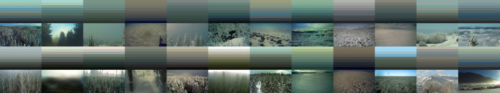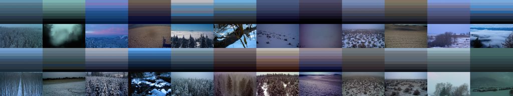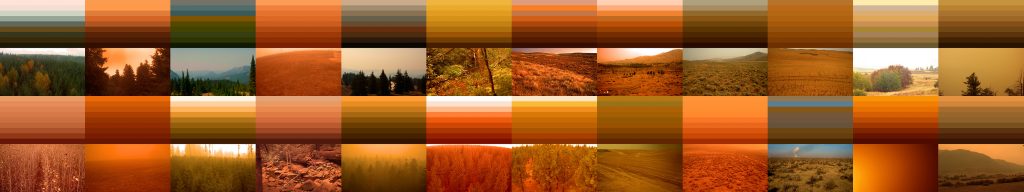 Informed by this color-driven research process and in collaboration with Dr. Christopher Still, Professor of Forest Ecosystem Science at Oregon State University, video artist Julia Oldham has translated each frame of Phenocam timelapses from sites around the Cascadia region into palettes that represent the 10 most common colors in each photograph, abstracting the landscape into a color field. In September: Orange, Oldham sorts the grid of timelapse and palette sequences to find moments of color unity, when the landscapes all turn a similar shade. Restricting herself to images taken at 10:00 AM, she is looking for color patterns across seasons and years of data collection. What are the visible conditions when the landscape turns purple? What season is it when chartreuse is a dominant color in the palette?