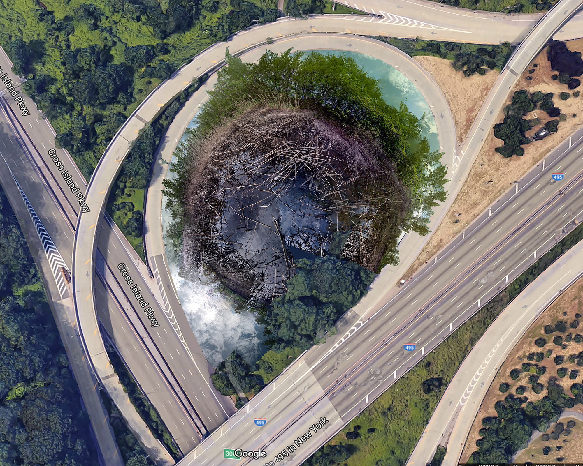 In “The Weird In-Between” (2019), you see a 360-degree photo of a small wetland that is encircled by a satellite map image of a highway cloverleaf in Alley Pond Park in Queens. This little wetland, which is full of frogs, fish, insects and birds, represents the rich possibility of the pieces of undeveloped land that run alongside highways and ramps. I spoke to scientists with the Natural Areas Conservancy and the Urban Field Station who suggested that these natural areas could potentially be oases for pollinators and migratory birds in the city if they are nurtured and allowed to become wildernesses and wetlands rather than patches of mown grass. Spaces like this one are also valuable for wildlife because they are less likely to be disturbed by humans, since they are not as readily accessible or desirable to visit.