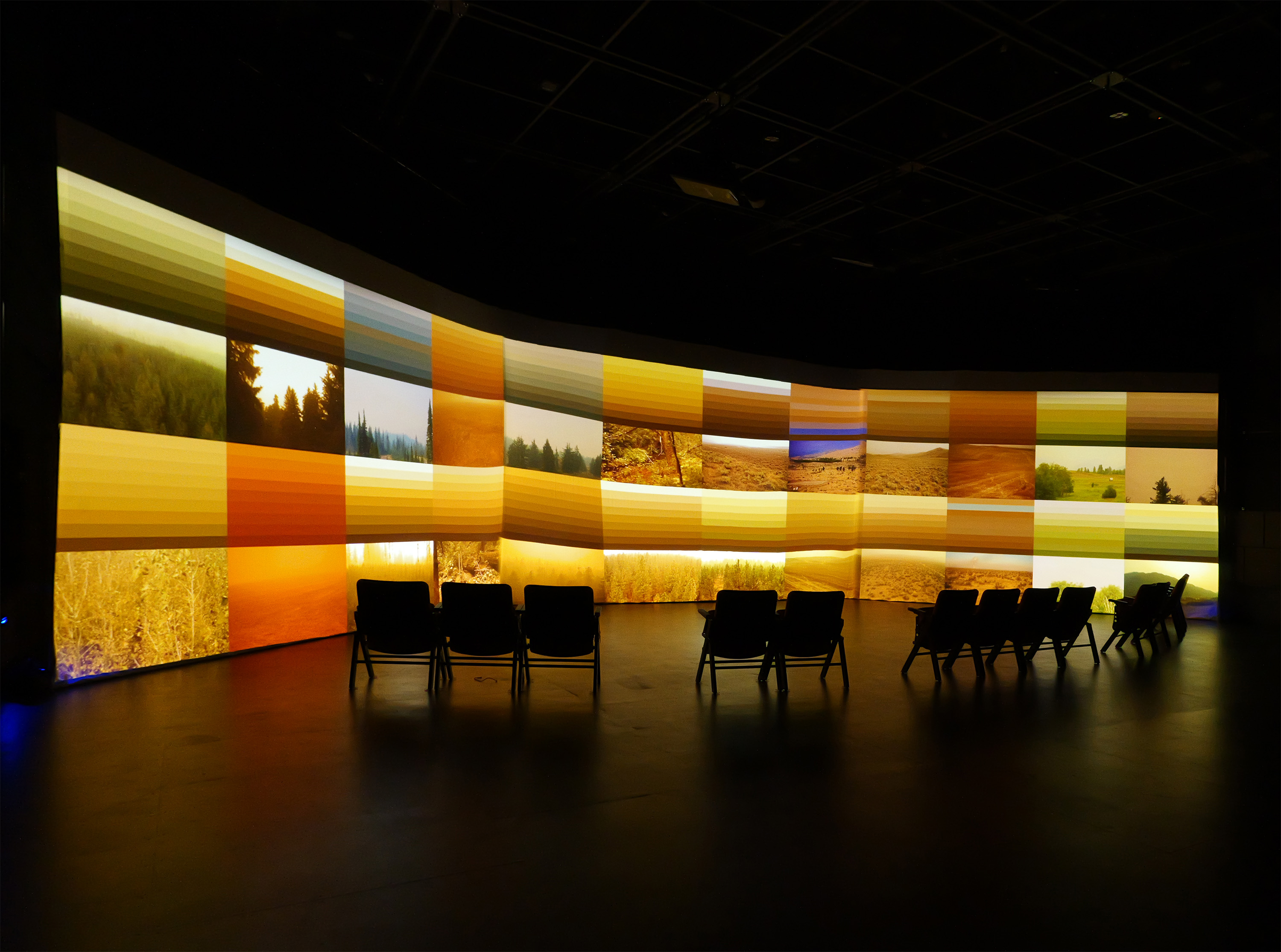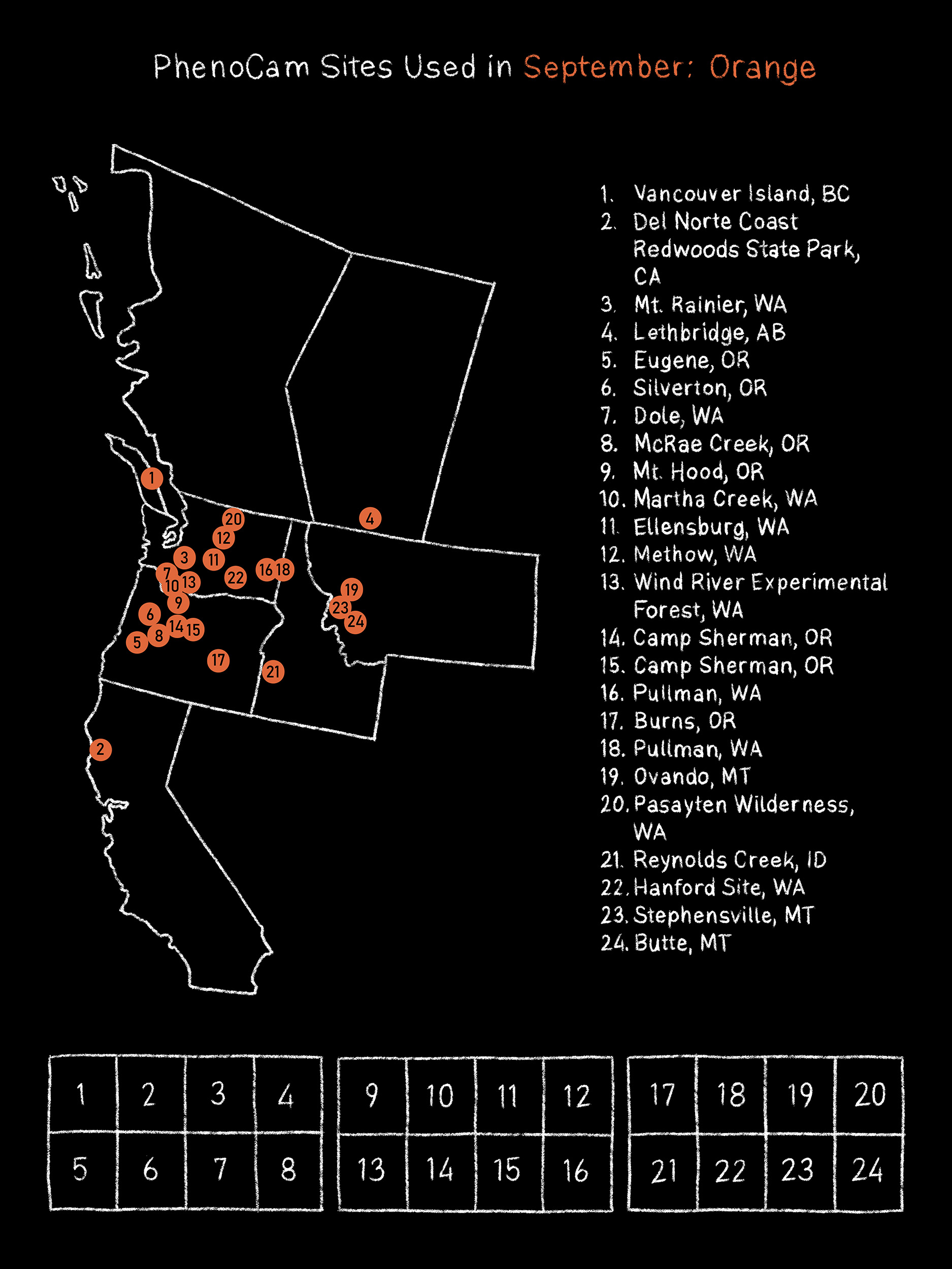 In this three-channel video, created in collaboration with Dr. Christopher Still, Professor of Forest Ecosystems and Society at Oregon State University, I look for moments of color unity among 24 Phenocam streams in the Northwest US and Canada, pausing when the landscapes all turn the same shade. I am especially interested in the orange that appears cyclically during wildfire season. The soundtrack for September: Orange combines field recordings from Oregon forests with sonification of canopy greenness data.